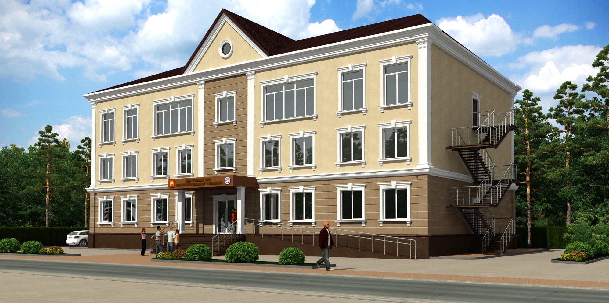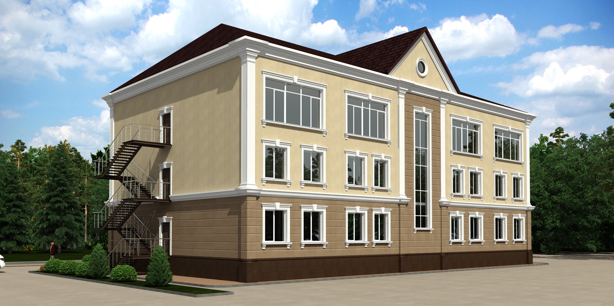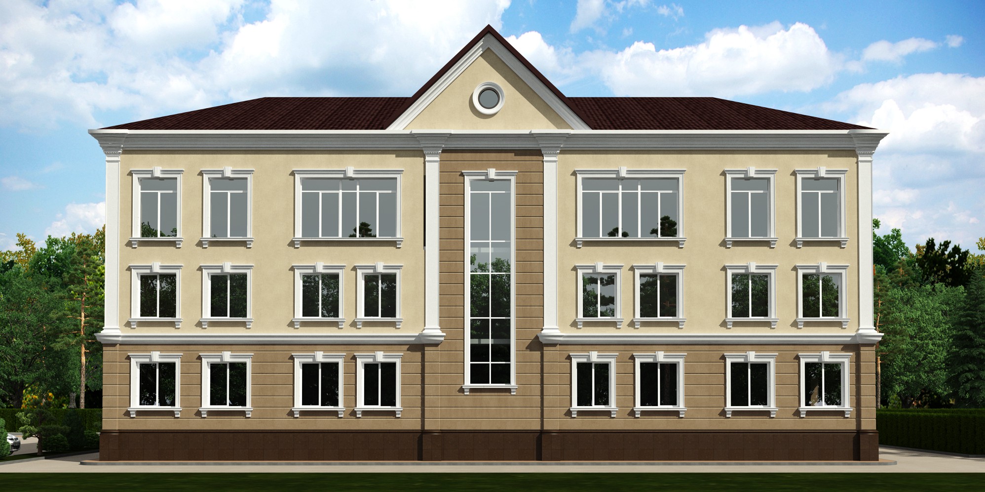 Фасад здания решен в тепловой цветовой гамме. Фасад утепляется минеральной ватой «ТехноФас», согласно теплотехническому расчету, с дальнейшей декоративной штукатуркой и окраской по сетке. Цвет стен фасада – бежевый. Цоколь облицовывается керамогранитом, коричневого цвета. В отделке фасада используется декоративные элементы фирмы «Экодеко» из стеклофибробетона, белого цвета. Над главным входом предусмотрен козырек, с покрытием из сотового поликарбоната, коричневого цвета.